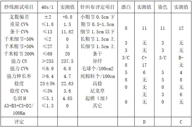 针织厂检测纱线的质量特性主要有:支数偏差、条干及千米纱疵、强力、强力不匀及伸长率、捻度及不匀率、毛羽、十万米纱疵A3+B3+C3+D2等;符合“门槛”指标后针织厂还会将目标供应商的纱线磅单纱平纹织物,并一半用于漂白,一半染色,然后对布面进行质量评定;确定用途后经过多次小量试用,针织厂才会进入批量使用。某知名针织企业面料主要评定项目及其与棉纱指标的对应关系如表1所示:
