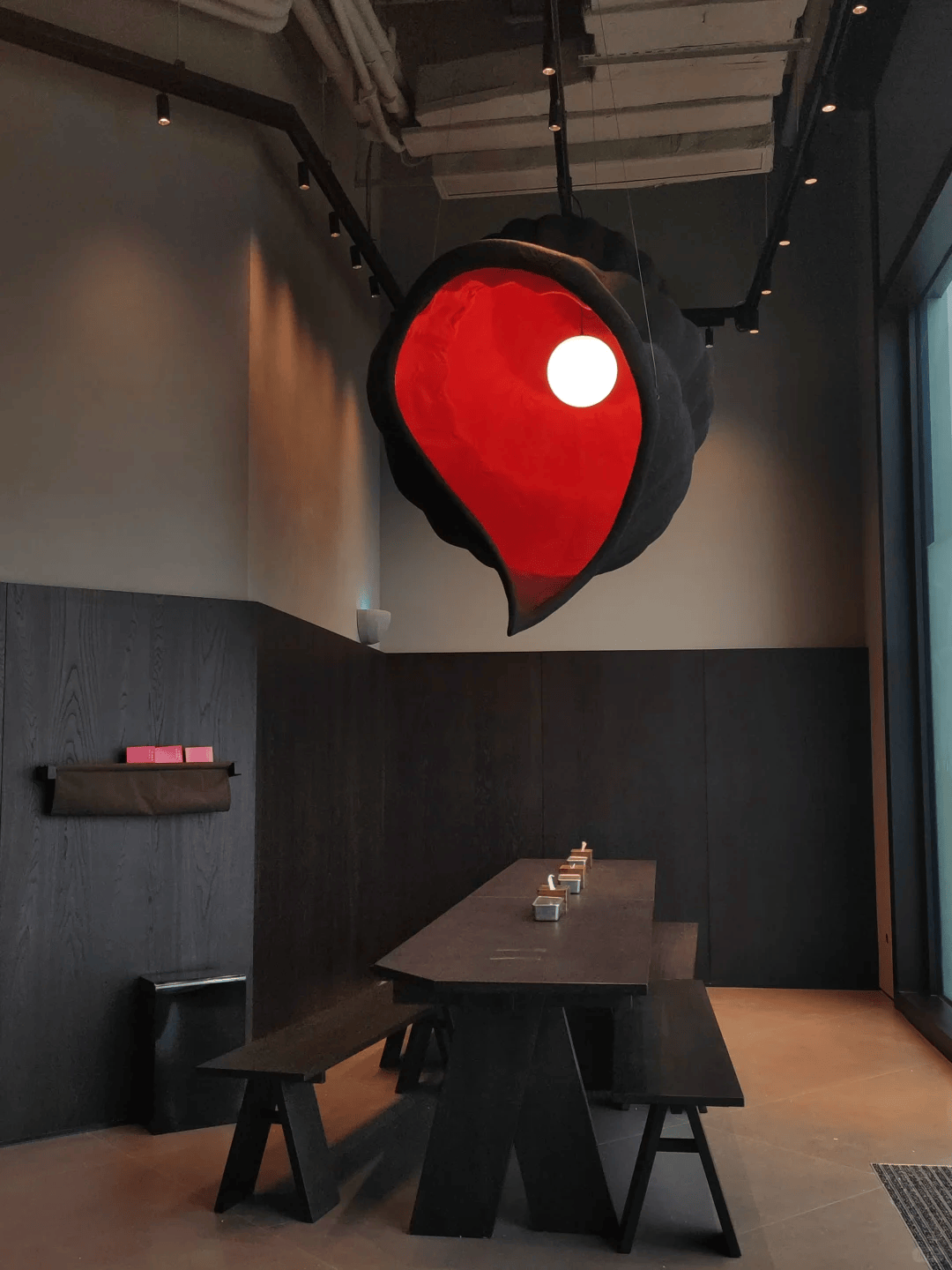 「LUÓ SHī 鑼獅」主打广西本土风味,菜单涵盖吊龙炒螺蛳粉、鑼狮红油卷粉等主食,搭配限量八妹鸽腿、慢炖玉林牛巴等特色小食。门店以黑红简约配色为主,螺蛳元素融入门把手、灯罩等细节设计中,搭配极具地域情怀的牌匾,以广西菜精致化表达为切入点,串联起地域人文与商业价值。